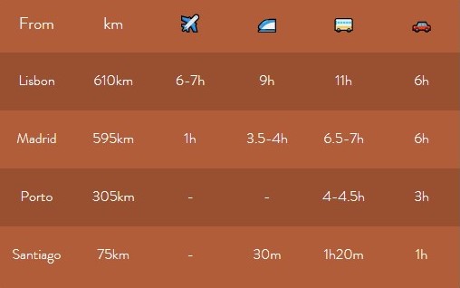 O Aeroporto de Santiago de Compostela (SCQ), a cerca de 68 km de distância, também é um opção com conexões internacionais mais amplas, incluindo Londres.